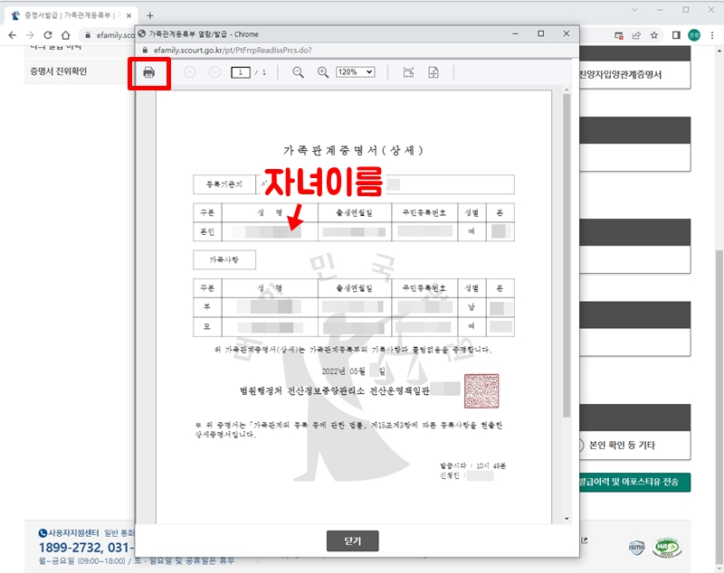 화면에 가족관계증명서 미리보기 화면이 떠요.
