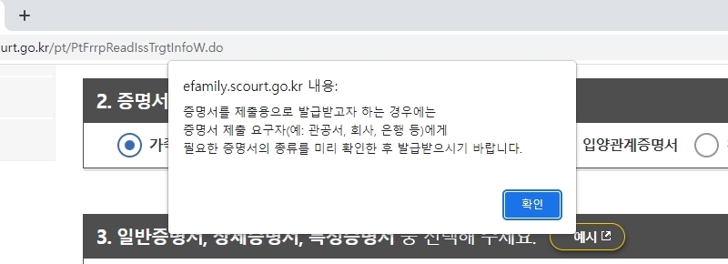 그러면 "증명서를 제출용으로 발급받고자 하는 경우에는 증명서 제출 요구자(예:관공서, 회사, 은행 등)에게 필요한 증명서의 종류를 미리 확인한 후 발급받으시기 바랍니다."라는 확인창이 하나 떠요.