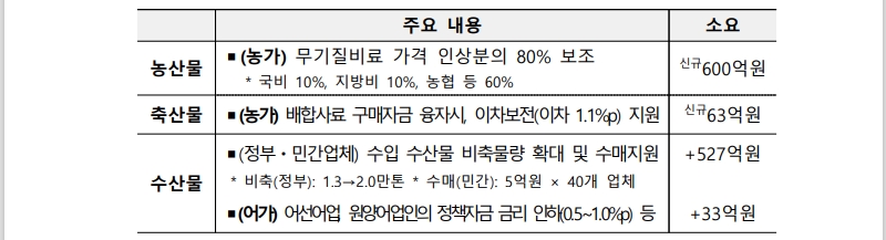 ◇ 생활물가 안정을 위해 농축수산물, 가공식품 등 생산부담 경감 지원