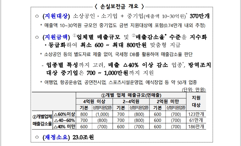 ▪ 손실보전금(600~1,000만원 맞춤형 지원) 23.0조원