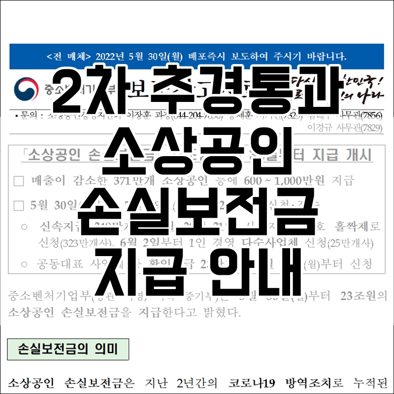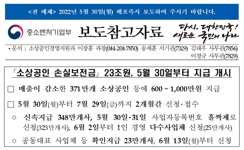 중소벤처기업부(이하 중기부)는 5월 30일 월요일부터 23조원의 소상공인 손실보전금을 지급한다고 밝혔습니다.