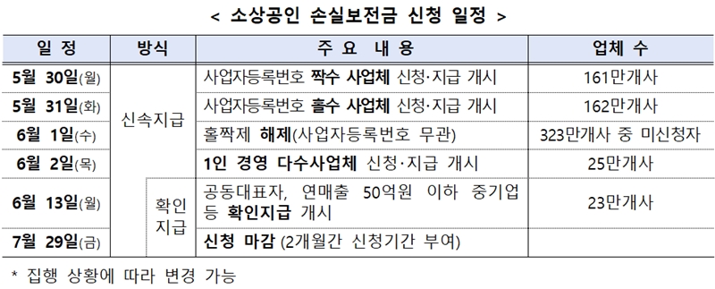 5월 30일(월) 사업자등록번호 짝수 사업체 신청.지급 개시 (161만개 사업체) - 신속지급 방식