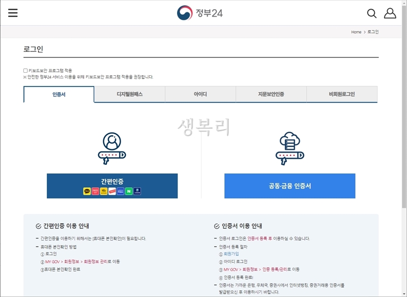 이때 공동인증서 등이 필요합니다.