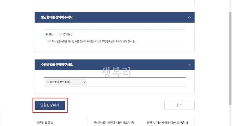 그리고 [민원신청하기] 눌러주세요.