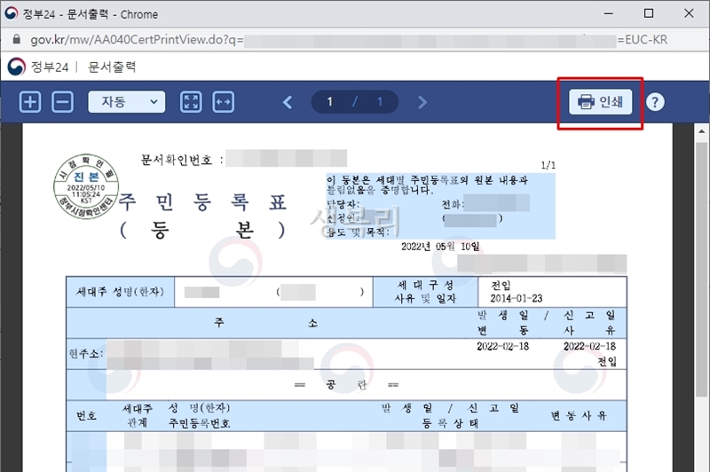 그러면 아래와같은 주민등록등본 미리보기 창이 뜹니다.