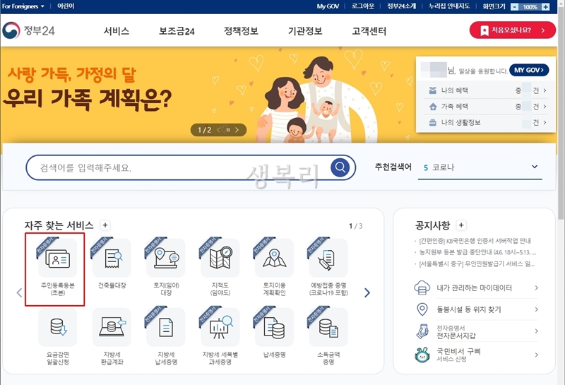 정부24에 들어가서 로그인을 하세요.