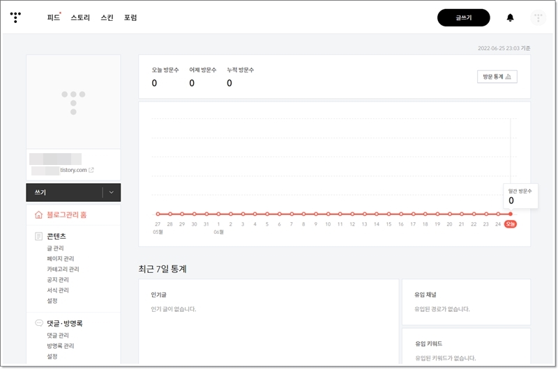 새로 만든 티스토리 블로그 관리페이지라서 방문수는 0이 떠요.