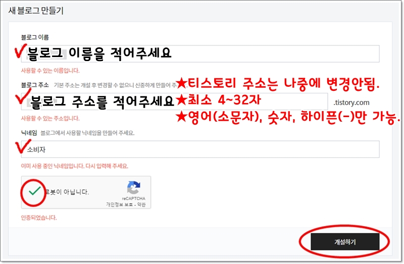 3. 블로그이름, 주소, 닉네임 넣고 로봇아님 체크하고 [개설하기] 누른다.