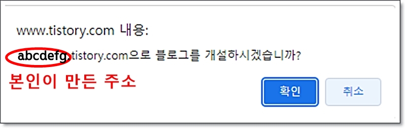 개설하기 누르면 이렇게 아래와같이 티스토리 주소로 블로그 개설하시겠습니까 하고 물어요.