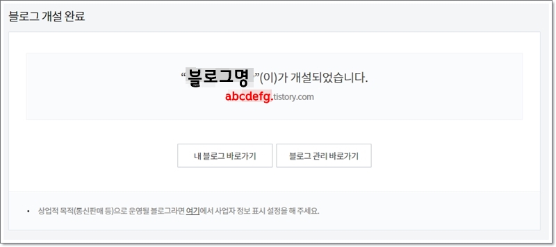 오류창 없이 바로 블로그가 만들어지면 아래와같이 '블로그 개설 완료'라는 화면이 나오면서