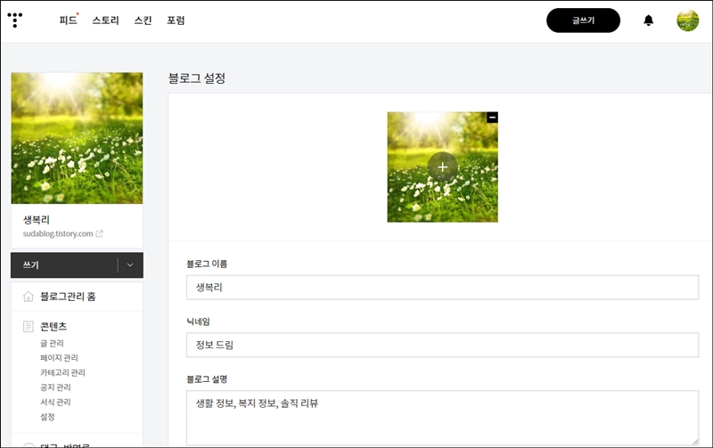 지금 적어드릴 티스토리 프사(프로필 사진), 블로그명, 닉네임, 설명(소개말)은 모두 같은 메뉴안에 있어서