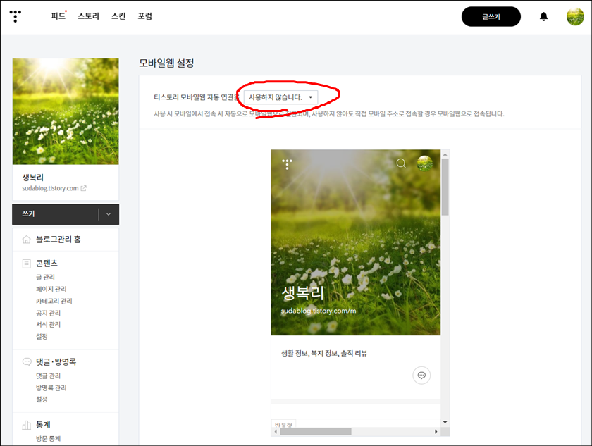 이런식으로 각자 쓰는 스킨에 따라 티스토리 모바일웹을 사용할지 안할지를 결정하여 설정하시면 됩니다.