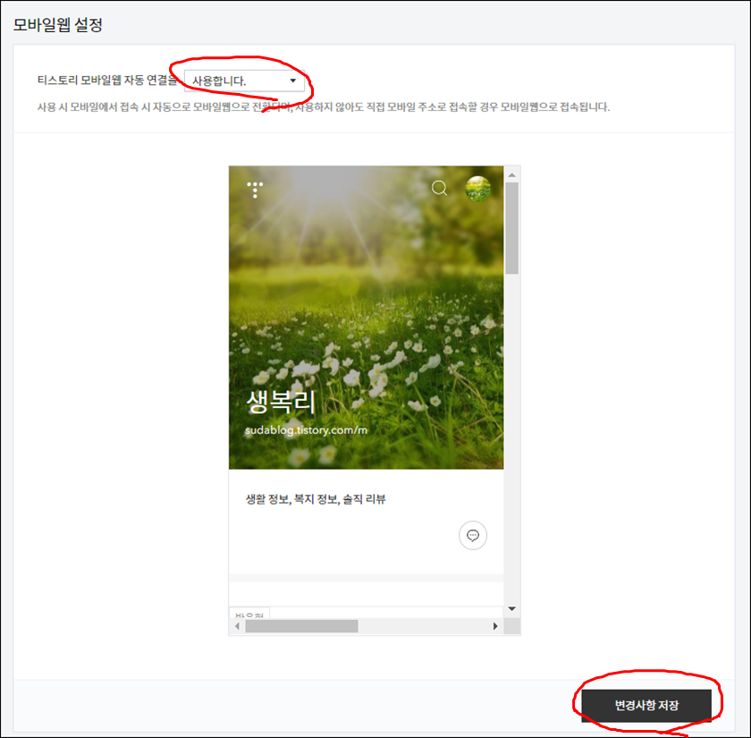 티스토리 모바일웹 자동연결을 [사용합니다 / 사용하지 않습니다] 둘 중에 선택을 하시면 되요.