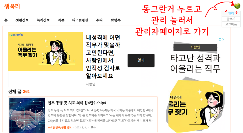 동그란 프로필 사진 아이콘을 누르고 "관리" 메뉴 눌러서 관리페이지로 들어갑니다.