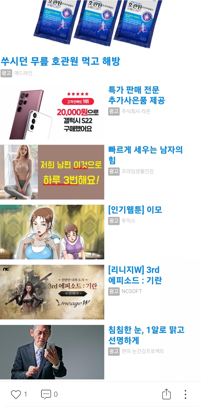 모바일웹의 맨 아래에 광고가 저렇게 드글드글 떠있지만, 글과 너무 떨어져서 아랫쪽에 광고가 있어서 저기까지 내려보는 사람이 없을 위치라서 나오나 마나거든요.
