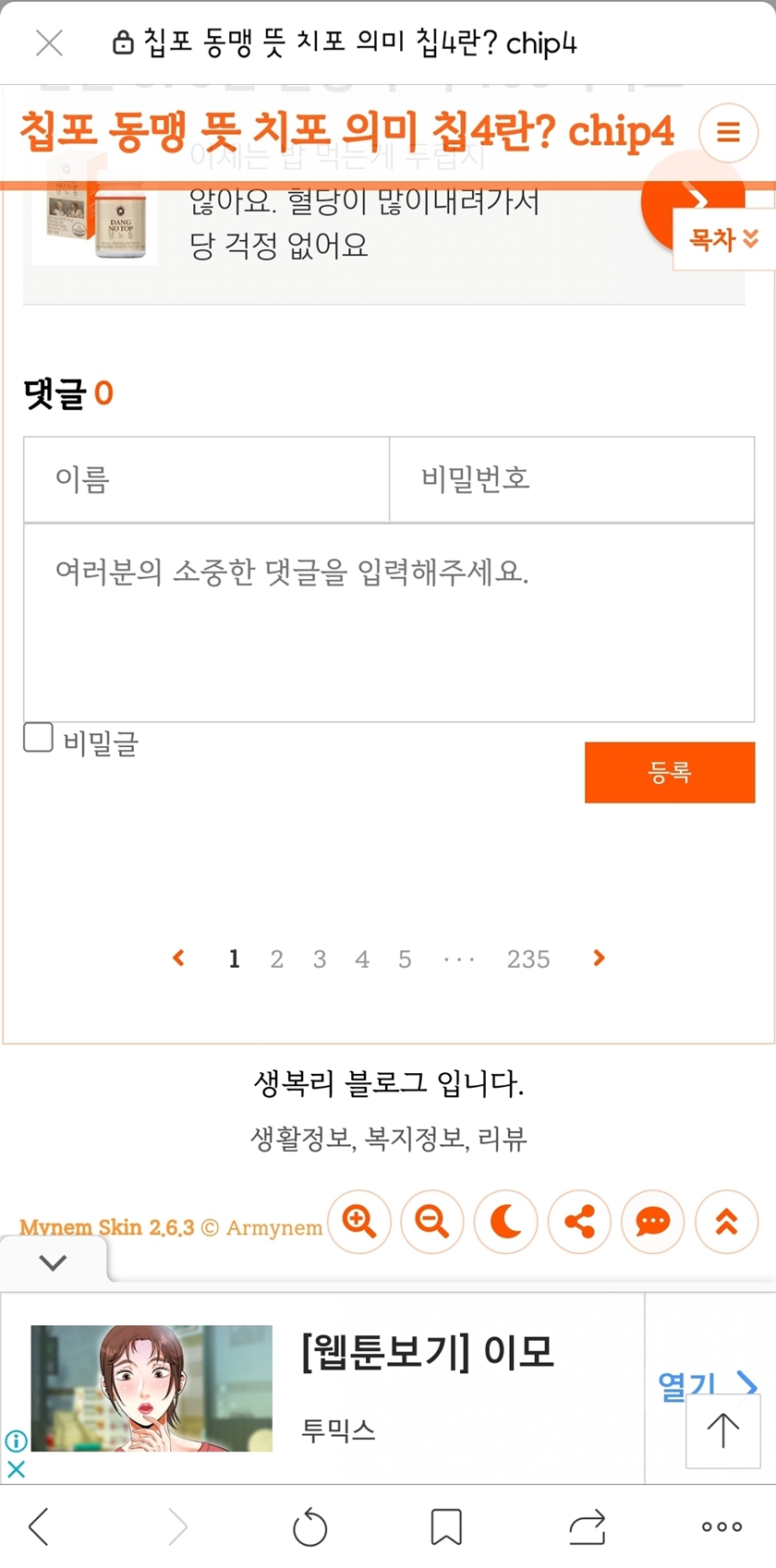 중간부분 캡쳐가 없어서 광고가 티스토리 모바일웹에서 더 많이 떠있는것 같은데 실상은 보면 저 같은 경우는 미넴스킨으로 뜬 위에 글이 훨씬 광고가 많이 떠있고 광고 위치도 더 좋아요.