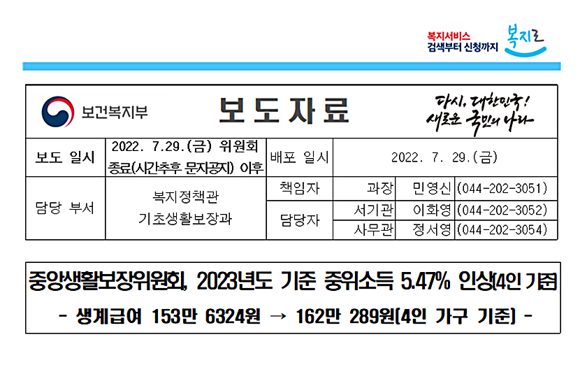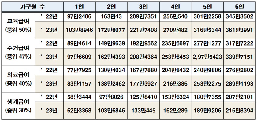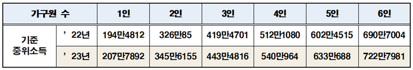 2023년도 기준 중위소득은 윤석열 정부의 '저소득층에 촘촘하고 두텁게 지원한다'는 정책 기조에 따라 대내외의 어려운 경제 여건에도 불구하고, 맞춤형 급여체계로 전환된 2015년 이후 역대 최고 증가율이라고 합니다.