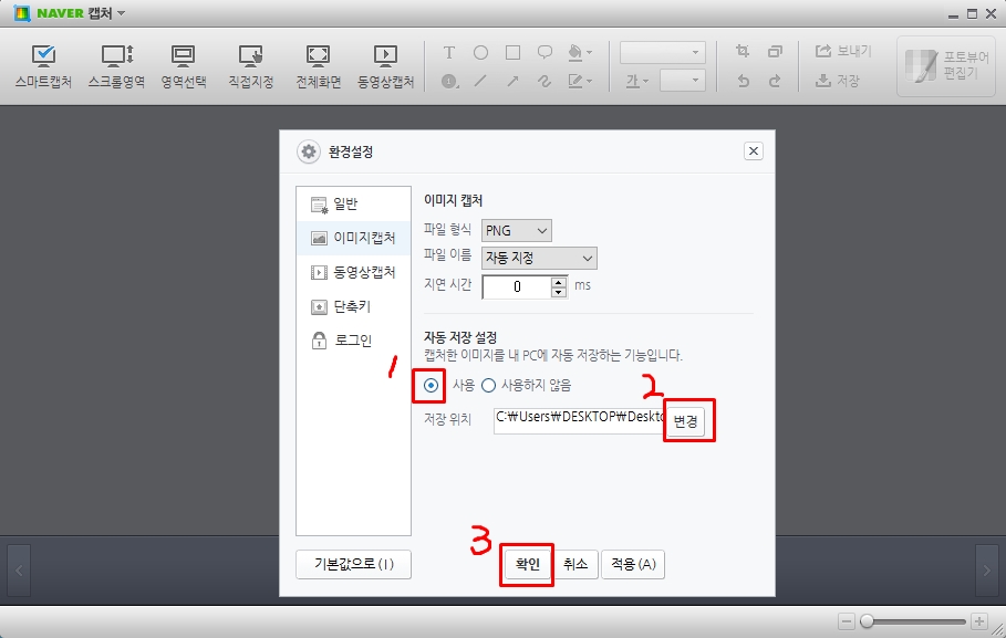 저는 바탕화면이 편해서 바탕화면으로 캡쳐 이미지 자동저장되게 해뒀습니다.