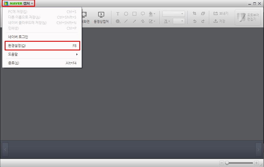 네이버캡쳐 왼쪽 맨위에 "NAVER 캡쳐"를 누르고 나오는 메뉴에서 "환경설정" 누릅니다.