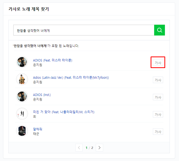 "가사"라는 단어를 붙여서 생각나는 노래 부분 적으시면 쉽게 찾을 수 있어요.