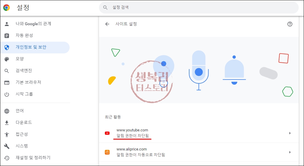 사이트 설정 누르면 아래와 같이, 최근 활동 이라고 해서 사이트 몇 개가 나와있는데 여기 보면 알림권한이 허용됨으로 되어있는게 있고 차단됨으로 되어있는게 있어요.