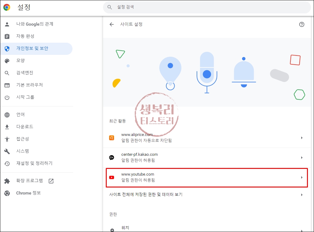 아까 각 사이트들 알림권한이 차단됨 또는 허용됨 적혀있던 그 부분을 다시 보면 아까 유튜브 알림 허용됨으로 되어있던게 차단됨으로 바뀌어있는걸 볼 수 있어요.