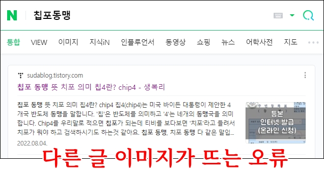 위에 보시다시피, 글은 칩포동맹인데 썸네일은 등본 인터넷 발급이 떠있는 식으로 이런 오류글이 여러개 네이버에 보이더라구요.
