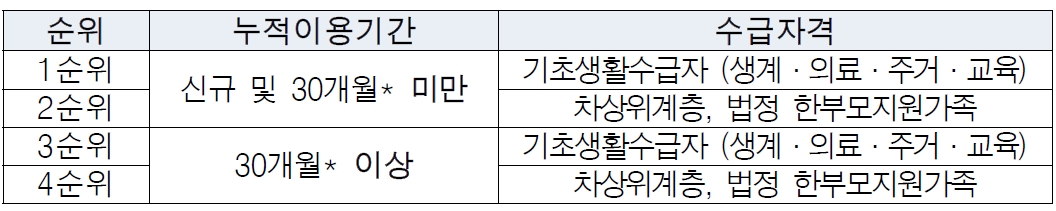 그러니까 1순위는 신규 및 30개월 미만이면서 기초생활수급자 가정의 아동.청소년이고
