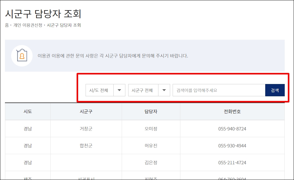 시/도 전체 선택, 시군구 전체 선택 후 [검색] 누르면 해당 시군구 담당자 이름과 전화번호가 딱 나옵니다.